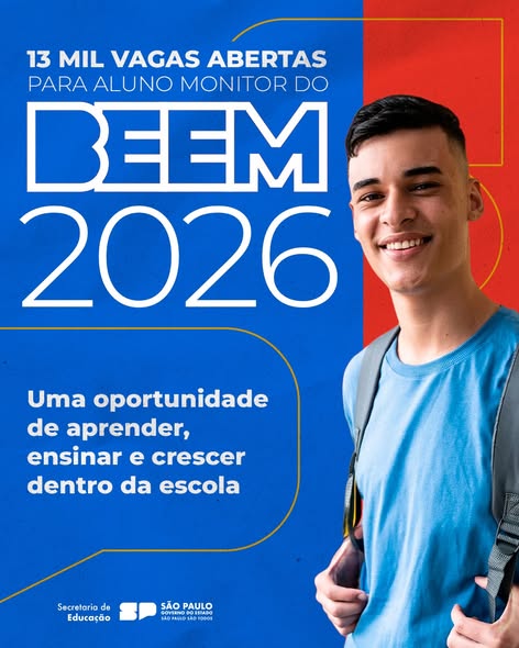 Estudantes da 1ª, 2ª e 3ª série do Ensino Médio, com idade mínima de 14 anos, podem se candidatar para atuar como Aluno Monitor, apoiando estudantes: da 1ª, 2ª e 3ª série do Ensino Médio; do 6º ano e do 9º ano do Ensino Fundamental – Anos Finais.