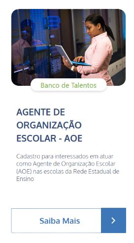 BANCO DE TALENTOS – AGENTE DE ORGANIZAÇÃO ESCOLAR (AOE) – 2026 A Secretaria da Educação do Estado de São Paulo informa que estão abertas as inscrições para o Banco de Talentos – Agente de Organização Escolar (AOE), destinado ao cadastro de interessados em atuar nas unidades escolares da Rede Estadual de Ensino, no ano de 2026. A inscrição no Banco de Talentos tem como objetivo registrar o interesse do candidato em exercer a função de Agente de Organização Escolar (AOE), possibilitando sua convocação para os Processos Seletivos Simplificados (PSS), conforme a necessidade das unidades escolares. Edital – CLIQUE AQUI |