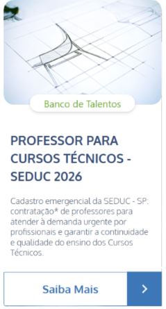 BANCO DE TALENTOS – PROFESSOR PARA CURSOS TÉCNICOS – 2026 A SEDUC-SP mantém um cadastro emergencial para a contratação* de professores para atuar nas turmas dos Cursos Técnicos, com o objetivo de atender às demandas urgentes por profissionais, garantindo a continuidade e a qualidade do ensino.Serão considerados elegíveis os profissionais com formação na área do curso ou que comprovem Notório Saber, por meio de experiência profissional significativa na área de conhecimento relacionada. *A contratação está sujeita à disponibilidade de vagas após a conclusão dos processos regulares de Atribuição de Aulas para professores efetivos e classificados nos processos seletivos simplificados. Consulte os Planos dos Cursos Técnicos e verifique se você está apto a lecionar, considerando sua formação acadêmica e experiência profissional. Planos dos cursos Técnicos: clique aqui As aulas dos cursos técnicos são ministradas, predominantemente, no período matutino e vespertino (entre 7h e 16h). Requisitos – (MÍNIMO) FORMAÇÃO NAS ÁREAS DOS CURSOS ACIMA ESPECIFICADOS OU QUE DEMONSTREM NOTÓRIO SABER NA ÁREA DE CONHECIMENTO, COMPROVANDO SIGNIFICATIVA EXPERIÊNCIA PROFISSIONAL NO CURSO EM QUESTÃO