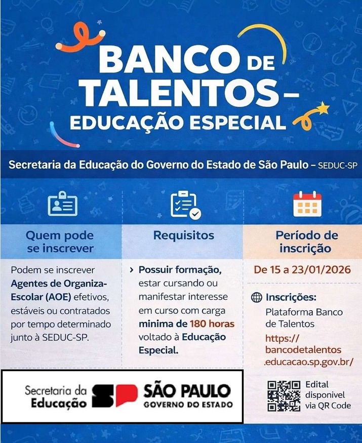 15/01/2026 – EDITAL – Banco de Talentos – Agente de Organização Escolar – AOE – VEJA AQUI – VEJA O BANNER